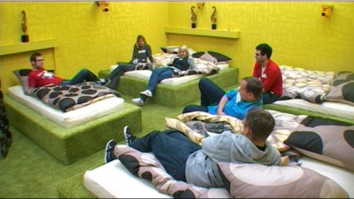 Weil die Hühner angeliefert wurden, schickte der Große Bruder seine Kandidaten für einige Minuten ins Schlafzimmer. Hier: Gruppe zwei im gelb-grünen Schlafgemach.