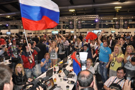 Die russischen Pressevertreter feiern mit ihrem Sänger - der Medienrummel war groß.