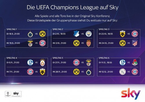 Anders als bisher zeigt Sky pro Sendetag neben der Konferenz nur noch ein Spiel in voller Länge. Dabei hat Sky während der Gruppenphase mittwochs immer das Recht, das aus seiner Sicht beste Spiel zu picken, dienstags muss man DAZN am zweiten, vierten und sechsten Spieltag den Vorrang lassen.