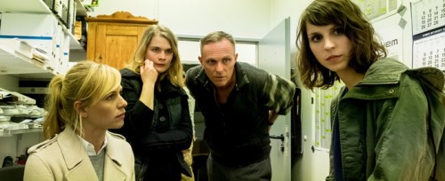 Die Kommissarinnen Luna Kunath (Caroline Erikson, r.) und Sophie Pohlmann (Katrin Jaehne l.) schauen sich gemeinsam mit dem Tankstellenbesitzer Peter Wendt (Dirk Martens, 2.v.r.) und seiner Mitarbeiterin Anja (Anna Schimrigk, 2.v.l.) die Überwachungsbänder vom Zeitpunkt des Mordes an.