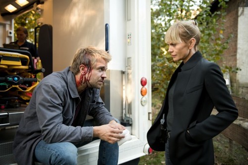 Christian Jännicke (David Korbmann), der eine blutende Wunde über dem Ohr hat, sitzt in der Tür eines Krankenwagens und schaut zu Helen Dorn, die neben dem Krankenwagen steht.