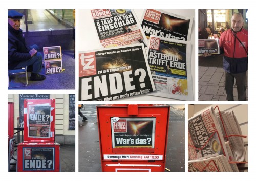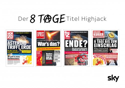 «8 Tage», in der Deutschland und weitere Teile Europas vom Einschlag eines Meteoriten bedroht sind. Die Serie startet am Freitag kommender Woche bei Sky1. Cosimo Möller, Vice President Creative bei Sky Deutschland: "«8 Tage» ist eine der mutigsten und gewaltigsten Serien des Jahres. Wie könnten wir die Endzeitstimmung der Serie ganz Deutschland besser näher bringen, als sie in die Realität zu holen? Das Thema der Serie als 'echte' Schlagzeilen auf die Titelseiten der größten Publikationen Deutschlands zu bringen, garantiert uns maximale Aufmerksamkeit. Wir nutzen eine nie zuvor verwendete Plattform als wirkungsstarke Werbefläche unserer Botschaft so breitenwirksam und aufsehenerregend wie möglich - und das über die großen Städte Deutschlands hinweg."