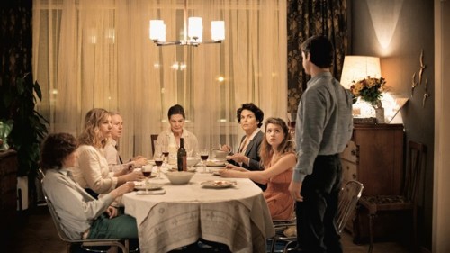 Roland (Aaron Hilmer r.) erinnert während des Geburtstagsessens seiner Großmutter Else (Angela Winkler, M.) an seine tote Mutter und verursacht damit einen Familienstreit (v.l.n.r.: Michelangelo Fortuzzi, Nadja Uhl, Joachim Król, Angela Winkler, Barbara Auer, Janina Fautz, Aaron Hilmer).