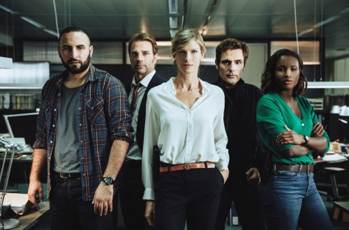 Der Cast der neuen Serie von links nach rechts: Oussama Kheddam (Rolle Fred Fontaine), Thomas Jouannet (Rolle Thomas Leclercq), Alexia Barlier (Rolle Sophie Cross), Cyril Lecomte (Rolle Gabriel Deville), Mariama Gueye (Rolle Amina Dequesne)