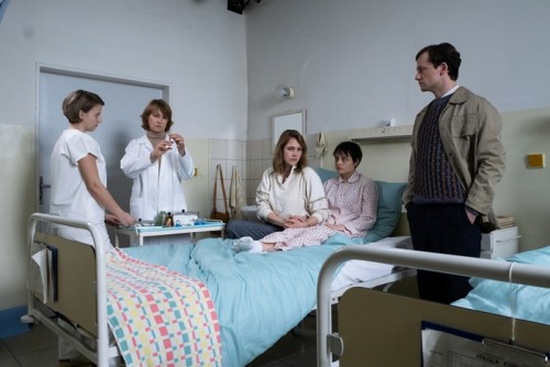 Marie Glaser (Felicitas Woll, M.) und Armin Glaser (Florian Stetter, r.) hoffen auf eine Besserung im Krankheitsverlauf ihrer Tochter Kati Glaser (Lena Urzendowsky, 2.v.r.). Dr. Sigurd (Corinna Harfouch, 2.v.l.) steht zwischen Patientin und Doppelblindstudie.
