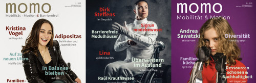 Das Magazin "Momo - Mobilität Motion & Barrierefrei" erscheint kostenlos in der Momo Verlagsgesellschaft mbh & Co. KG in Damp. Die Redaktion der Zeitschrift hat es sich zur Aufgabe gemacht, in jeder Ausgabe interessante und innovative Beiträge für und über Menschen mit Behinderung zu veröffentlichen. Dabei arbeiten die Schleswig-Holsteiner in enger Kooperation mit Herstellern für Hilfsmittel, die Menschen mit Behinderung im Alltag unterstützen, zusammen. Sie zeigen in jeder Ausgabe neues auf und dass Hilfsmittel auch Lifestyle sein können.