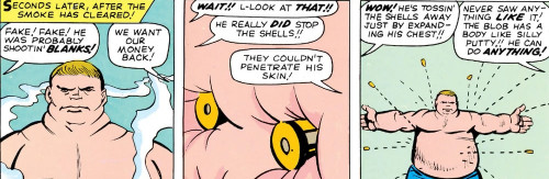 Allerdings waren das nicht seine einzigen Superkräfte. Aufgrund seiner Essstörung hat Blob ein sehr flexibles Fettgewebe, was ihm hilft, Stöße oder Schläge nicht nur mühelos wegzustecken, sondern auch zu reflektieren. Der Einsatz von diversen Waffen wie Gewehren oder gar Bazookas ist daher dringend abzuraten. Trotz seiner Fettschicht ist Blob extrem schnell und beweglich, was ab und zu auch den ein oder anderen Gegner überrascht. Auch seine Haut hat es in sich, Ihre Zellen reproduzieren sich so schnell, dass kaum ein bekanntes Material durch sie hindurch kommt oder gar zerreißen kann. Selbst Hautkrankheiten oder einfrieren ist nicht möglich. Damit das Ganze auch nicht an Wirkung verliert, kommt zu guter Letzt noch seine übermenschliche Stärke dazu, die sich auch noch im Laufe der Jahre erhöht. Einen Mann in die Luft zu werfen ist da die leichteste Übung für Blob.
