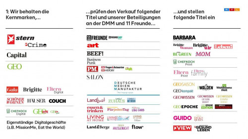 Alle weiteren Titel und Ableger werden verkauft oder eingestellt, hieß es weiter. Über den Verkauf der Beteiligung an der Deutschen Medien-Manufaktur (DMM) werde RTL Deutschland vertrauensvolle Gespräche mit dem Mitgesellschafter Landwirtschaftsverlag Münster aufnehmen. Auch für die Beteiligung an ‚11 Freunde‘ wird ein Verkauf geprüft.