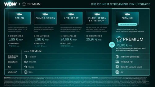 Ab jetzt gibt es neue Basis-Abos, die Werbung enthalten, sowie ein WOW Premium Upgrade. Das günstigste Angebot liegt bei 5,99 Euro für das WOW-Serien-Paket. Der Preis gilt allerdings nur, wenn man sich direkt sechs Monate bindet. Das WOW-Filme- & Serien-Angebot liegt bei 7,98 Euro in diesem Modell. Die Preise im monatlich kündbaren Abo liegen jeweils zwei Euro darüber. Wer das Angebot ohne Werbung in der Premium-Variante genießen möchte, zahlt fünf Euro obendrauf.