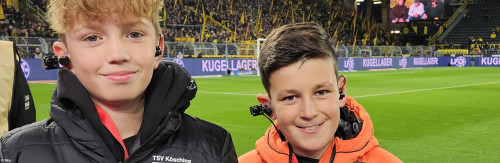 Stattdessen waren Ben und Moritz, der BVB-Trainer Edin Terzic vor der Partie ausfragte, bestens vorbereitet. Beide Trainer formulierten nach ihren Interviews zurecht lobendende Worte, und auch Frank Buschmann, der das Spiel zusammen mit dem Duo begleitete, sah des Öfteren keinen Anlass selbst zu sprechen, da die beiden Nachwuchskräfte ihre Sache ausgesprochen gut machten. Selbstverständlich klappte nicht alles ruckelfrei, das ist in diesem Alter auch nicht zu erwarten. Manches Mal fielen sie sich gegenseitig ins Wort oder analysierten die Spielszenen ein wenig zu schnell, sodass Buschmann Tipps gab und die beiden auf die nahende Zeitlupe hinwies.
