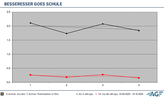 Machen wir uns nichts vor: «besseresser goes Schule – Lege packt’s an» war ein riesiger Flop. Nur 1,94 Millionen Menschen ab drei Jahren sahen die vier Folgen, der Marktanteil lag bei 9,7 Prozent. Noch problematischer sind die Werte bei den jungen Menschen. Das Format hat entweder die Eltern nicht gefunden – oder die Eltern haben das Programm nicht gefunden: Lediglich 0,22 Millionen 14- bis 49-Jährige schalteten ein, der Marktanteil wurde auf 6,5 Prozent beziffert. In Deutschland gibt es über elf Millionen Schulkinder und rund 29 Millionen Eltern, die Kinder im Schulalter haben.