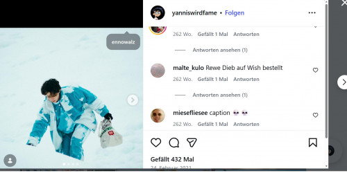 Die Vermutung einer konkreten Zusammenarbeit nährt in diesem Fall wieder der gemeinsame Standort Hannover. Doch nicht nur das: Erstmals lässt sich hier ein belegbarer Zusammenhang ausmachen: Ein Branding-Fotograf ist der Urheber mehrerer Instagram-Bilder von Yannis B. - eines davon zeigt ihn in Designerkleidung und auffällig sichtbarem Rewe-Beutel im Schnee – erstellt bereits 2021. Die Grundrahmung für dieses Arm-aber-sexy-Narrativ des Vintage-Supermarkt-Gammlers wurde also augenscheinlich bereits vor vier Jahren auf den Weg gebracht, und nicht erst 2025, wie Yannis B. in einem kürzlich erschienenen Interview weismacht.