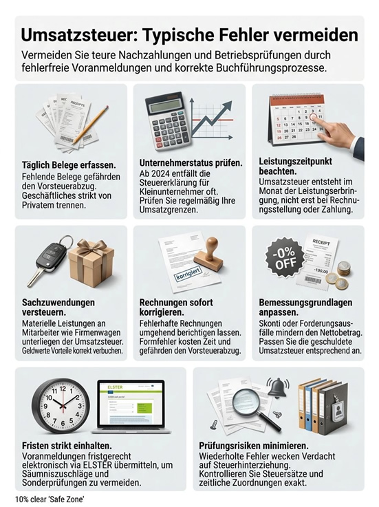 Prüfen Sie deshalb Unternehmerstatus, Kleinunternehmerregelung, Steuersätze und die technische Abgabe der Voranmeldung laufend. Wer Buchhaltung und Belegprüfung sauber organisiert, senkt das Risiko von Nachzahlungen und Rückfragen deutlich.