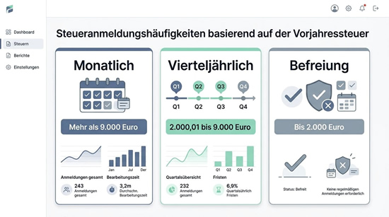 Die Einreichungsfrequenz richtet sich 2026 nach der Steuer des Vorjahres oder bei Neugründungen nach der voraussichtlichen Steuer des laufenden Jahres. Die seit 2025 geltenden Schwellen sind höher als viele ältere Leitfäden noch ausweisen.