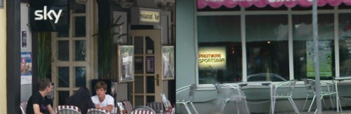 Bei Saisonrückblicken zur zurückliegenden Bundesligasaison wurde das Bild bei Interviews so weit aufgezoomt, dass das Premiere-Mikro nicht mehr zu sehen ist. Kurzum: Sky möchte mit Premiere am Besten rein gar nichts mehr zu tun haben. Am vergangenen Wochenende wurde man dann aber von der Realität eingeholt. Etliche Wirte, die Vertragspartner des Bezahlsenders sind, nennen sich noch Premiere Sportsbar, wie unser am Montagnachmittag entstandenes Foto zeigt.