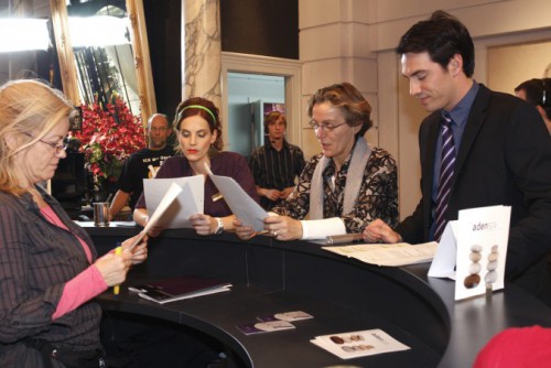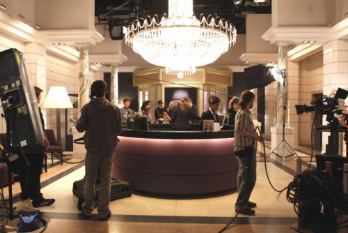 In dem zweistöckigen Studio wurden ab August 2009 innerhalb eines Monats die Kulissen für die Serie auf einer Gesamtfläche von 1.400 qm errichtet. Im Foyer hängen an einer Pinnwand alle Presseerwähnungen der Serie unter denen sich auch einige Artikel von Quotenmeter.de befinden. Das Zentrum der Produktion liegt im Obergeschoss des Gebäudes. Es ist die Eingangshalle des fiktiven Berliner Hotels Aden, dessen Namen eng an das realexistierende Nobelhotel Adlon erinnern soll. Die mit Abstand größte Kulisse des Sets ist 360 Grad bespielbar und besticht durch eine große Treppe, eine runde Rezeption, die direkt im Zentrum steht und eine kreisrunde Sitzgruppe. Glanzstück der Halle ist der riesige echte Kronleuchter über der Rezeption, der das edle Ambiente untermalen soll. Diesen in das Studio befördert und aufgehängt zu bekommen, stellte sich beim Bau der Kulissen als größte Anstrengung heraus. Ringsum das Foyer sind kleinere Orte des Hotels angesiedelt, von denen die Halle immer einsehbar ist. So gibt es einen Wintergarten, eine voll ausgestattete Küche, einen kleinen Speisesaal sowie eine edle Bar.