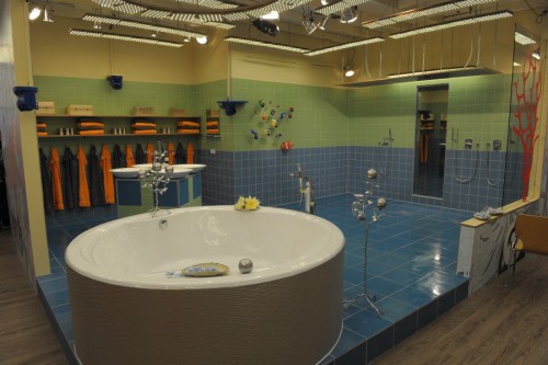 Das Bad im neuen «Big Brother»-Haus - es liegt dort, wo früher der Wohnbereich war. Regenwald-Dusche, vier Waschbecken, eine große Wanne. Vom Bild aus rechts geht es zum goldenen Sprechzimmer, weiter vom Garten weg (also eine Drehung nach links und dann in etwa gerade aus) liegen die beiden Schlafzimmer und der Zugang zum Mystery-Raum.