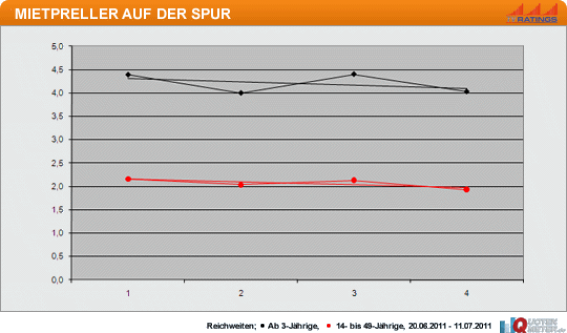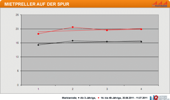 Und auch die beiden Folgen am 4. und 11. Juli konnten sich mit 4,40 und 4,03 Millionen Zuschauern ab drei Jahren über der Vier-Millionen-Zuschauermarke halten. Mit 15,5 und 15,4 Prozent Marktanteil beim Gesamtpublikum erzielten die beiden Folgen sehr ähnlichen Quoten. Und auch in der werberelevanten Zielgruppe sah es für beide Episoden sehr gut aus. Mit den erreichten 19,5 und 19,9 Prozent Marktanteil kann RTL zufrieden sein.