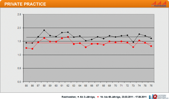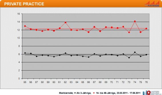 Am 27. April wurde die Folge «Familiensache» von rund 1,68 Millionen Zuschauern und 11,8 Prozent der 14- bis 49-Jährigen gesehen; «Was mit Charlotte King geschah» fesselte sieben Tage später durchschnittlich 1,83 Millionen und 12,4 Prozent der werberelevanten Bevölkerung. «Was nun?» dürften sich die Verantwortlichen bei ProSieben nicht gefragt haben, als die achte Folge der vierten Staffel von «Private Practice» im Schnitt 1,84 Millionen Zuschauer interessierte und mit 13,8 Prozent Marktanteil bei den Jungen erstmals über die 13-Prozent-Hürde kletterte. Mit dem Quotenglück war es nur eine Folge später aber auch schon wieder vorbei: «Kein Weg zurück» gab es für rund 1,66 Millionen Zuschauer und zwölf Prozent der wichtigen Zielgruppe. Die zehnte Folge wurde im Schnitt von 1,70 Millionen Zuschauern und 12,2 Prozent der Werberelevanten gesehen; die elfte Folge lockte durchschnittlich 1,52 Millionen Menschen und 12,2 Prozent der Zielgruppe zu ProSieben.