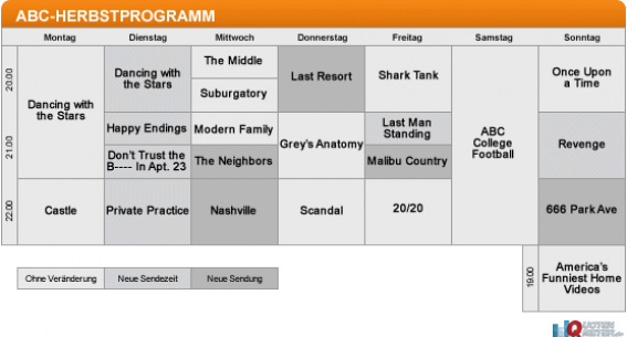 «666 Park Ave» (SO, 22 Uhr) bildet ABC inhaltlich eine relativ kohärente Strecke, die für eine positive Quotenüberraschung sorgen könnte, da außer «The Good Wife» nicht allzu große Konkrrenz lauert. Abseits von diesem Tag fehlen aber kohärente Programmierungen: Wenig verständlich ist beispielsweise, warum «Grey’s Anatomy» und «Private Practice» donnerstags nicht mehr gemeinsam senden; freitags zeigt man zwei halbstündige Comedies zwischen einer Reality und einem Magazin; dienstags läuft nun die Entscheidungsshow von «Dancing with the Stars» vor zwei Sitcoms und dem angesprochenen Drama «Private Practice». Verständlich ist dagegen, eine neue Comedy nach dem ABC-Hit «Modern Family» zu programmieren – ein solch starkes Lead-In sollte man ausnutzen.