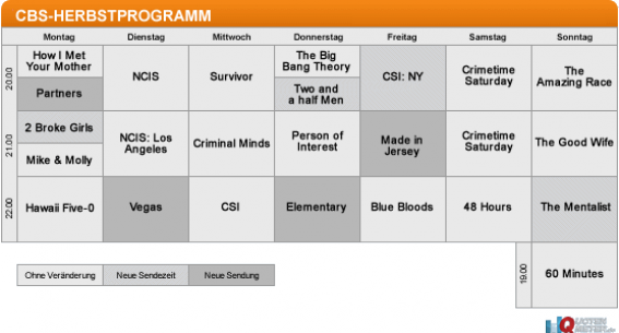 «Two and a Half Men»: Die Chuck-Lorre-Sitcom zeigt man nun donnerstags im Anschluss an den Quotenhit «The Big Bang Theory» – ein sehr kluger Schachzug, bedenkt man, dass die beiden Formate früher (in umgekehrter Startfolge) schon wunderbar harmonierten und dass bisher keine Sendung hinter «Big Bang» zum Erfolg wurde. CBS dürfte den Donnerstag mit dieser Programmierung nun klar dominieren. Allerdings reißt dies eine kleine Lücke am Montag, wo «Half Men» zuvor sendete – sollte hier die neue Comedy