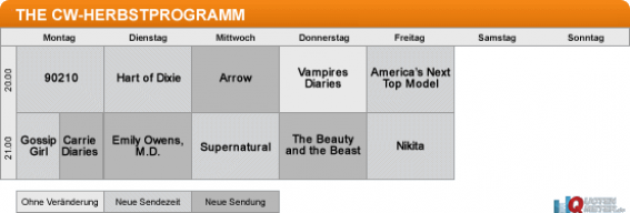 «Arrow», der als einziger CW-Neustart um 20 Uhr einen Abend eröffnen darf – nämlich am Mittwoch, direkt gegen die FOX-Castingshows wie «American Idol». «Arrow» ist eine Verfilmung der Geschichten um den Comiccharakter Green Arrow. Um 21 Uhr folgt mittwochs «Supernatural», das am Freitag um 21 Uhr durch «Nikita» ersetzt wird. «Nikita» bleibt damit auf dem Freitag, startet allerdings eine Stunde später nach «America’s Next Topmodel» – die Castingshow hat zuletzt schlechtere Quoten eingefahren und wird nun etwas aus der Schusslinie genommen. Vernünftig erscheint der Schritt, die Teen-Serien «90210» und «Gossip Girl» sowie den Neustart «Carrie Diaries» an einem Abend (Montag) zu bündeln. Am Dienstag erwartet The CW offenbar nicht mehr allzu viel: Das ohnehin bereits zuschauerschwache «Hart of Dixie» darf um 20 Uhr unter anderem gegen Entscheidungsshows von «The Voice» antreten, um 21 Uhr folgt das Teen-Medical-Drama «Emily Owens, M.D.», das dann etwas weniger Konkurrenz im Gegenprogramm hat.