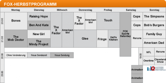 Diese Verschiebung eröffnet zudem ein Risiko am Dienstag: Hier war «Glee» um 20 Uhr bisher erfolgreich und verhalf anfangs der Comedy «New Girl» zu guten Quoten. Nun scheint FOX auf diesem Sendeplatz – die «Voice»-Entscheidungsshows laufen in Konkurrenz – wenig zu erwarten: Um 20 Uhr zeigt man die ohnehin quotenschwache Comedy «Raising Hope» und den Neustart «Ben and Kate», bevor «New Girl» um 21 Uhr seinen angestammten Platz behalten darf. Am Montag gilt das gleiche für «Bones» um 20 Uhr; im Anschluss folgt