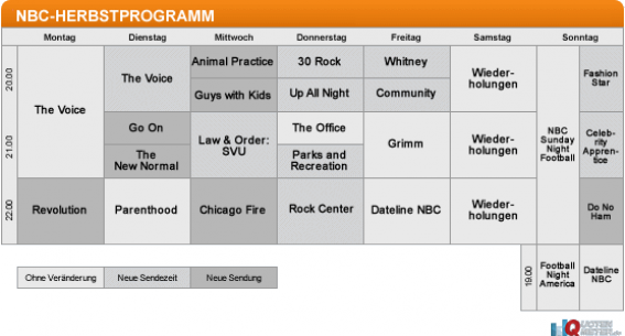 «Whitney» zu sehen, die vom Donnerstag verschwinden. Insgesamt füllt der Sender nun fünf Stunden mit halbstündigen Comedys – dies sind zwei mehr als im vergangenen Herbst. Einziger weiterer Drama-Neustart in diesem Jahr (neben «Revolution») ist die Feuerwehr-Serie