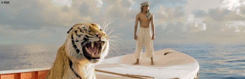 Auf hoher See tobt sich Ang Lee dann wahrhaftig aus, was Tricktechnik, opulente Bilder und Emotionen angeht. Gedreht wurde im größten Wellentank der Welt, zu sehen ist davon im Film rein gar nichts mehr. Da ist nichts als endloses nasses Blau, auf dem ein kleines Rettungsbötchen mit einem Tiger und einem Menschen an Bord umherschaukelt. Auch wenn einige Aufnahmen mit lebendigen bengalischen Tigern angefertigt wurden, entstand das Tier hauptsächlich am Computer. Der Spannung und Glaubwürdigkeit tut das jedoch keinen Abbruch, die Reaktionen und das Interagieren zwischen Tiger und Pi sind so flüssig, dass nicht auseinander zu halten ist, was nun real und was Trickserei ist. Außerdem darf man nicht vergessen, dass Suraj Sharama in der Titelrolle sein Schauspieldebüt gibt und sich mit seiner Performance ganz klar für weitere Projekte empfiehlt.