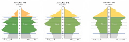 In den vergangenen 20 Jahren hat sich die Bevölkerungsstruktur in Deutschland erheblich geändert. Wie allgemein bekannt ist, bringt die deutsche Durchschnittsfrau (vor 1990 in den alten Bundesländern) 1,4 Kinder zur Welt, womit wiederum weniger Frauen im gebärfähigen Alter Kinder kriegen können. Laut Erhebungen des statistischen Bundesamts wurden 1990 noch 0,91 Millionen Kinder geboren, nur noch 0,68 Millionen waren es hingegen 2010. Zur Bestandserhaltung der Bevölkerung wären allerdings 2,1 Kinder pro Frau notwendig. Es sterben also mehr Menschen als dass Menschen geboren werden, während die Lebenserwartung steigt. Ein neugeborener Junge kann mit 75,9 Lebensjahren rechnen, während die Lebenserwartung eines deutschen Mädchens 81,5 Jahre beträgt.