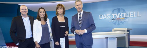Schon aus «Absolute Mehrheit» bekannt ist die lässige und lockere Körpersprache des ehemaligen VIVA-Manns. So ließ er es sich auch vor geschätzt rund 15 Millionen Zuschauern nicht nehmen, teils locker über dem Pult zu lehnen, eine Hand in der Hosentasche zu haben – und natürlich ohne Krawatte aufzutreten. Im Nachlauf übrigens machten die drei Sender, die eine ausführliche Analyse boten (RTL stieg zehn Minuten nach Ende des Duells aus, sendete «Spiegel TV»), auf ihre Weise einen guten Job. Während das ZDF mit dem «heute-Journal» zunächst einmal auf eine sehr nachrichtliche Aufarbeitung und die Präsentation erster Umfragen setzte, lieferte die ARD eine klassische Talk-Analyse – unter anderem mit zwei Männern, die früher Teil eines TV-Duells waren, nämlich Stoiber und Steinmeier.