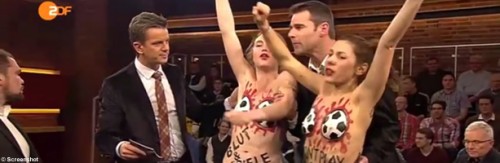 Plötzlich stürmten zwei nackte Mädels auf die Bühne und gröhlten unentwegt „Boykott FIFA-Mafia“. Sie wollten damit auf die verheerenden Umstände auf den Baustellen von WM-Stadien in Katar hinweisen. Binnen Sekunden war in Anzug gekleidetes Sicherheitspersonal da, was die Mädels mit energischen Handgriffen von der Bühne zerren wollte. Lanz schritt hier ein: „Hallo! Nicht rausschmeißen“, sagte er mehrfach zu seinem Personal – und zu den Mädels angesichts der sich stetig wiederholen Sätze. „Ja, wir haben das verstanden.“