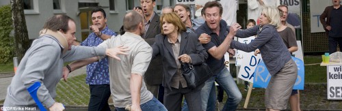 Welches Verhältnis ein Mensch (oder eine Institution) zum Rechtsstaat hat, lässt sich am einfachsten feststellen, wenn es um Triebtäter geht. Nachdem der vierfache Vergewaltiger Schmolzer aus der illegalen Sicherungsverwahrung entlassen werden musste, reichen die Slogans des Stammtisches in der neuen Folge von «Unter Verdacht» von „Hau ab, du Sau“ bis zu „Kastriert das Schwein!“. Wenn es nicht gleich zu gewaltsamen Übergriffen kommt, natürlich. Auch das ist nahezu an der Tagesordnung im bayerischen Wallershofen. Der wütende „Demonstranten“-Mob wirft mit Bierflaschen um sich, der Polizist Walter Maiberger prügelt den Schwerkriminellen bei einer Verkehrskontrolle krankenhausreif.