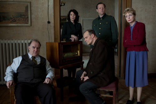 Gespannt verfolgen die Gäste im Zeugenhaus die Radioberichterstattung zum Beginn der Nürnberger Prozesse. V.l.n.r: Heinrich Hoffmann (Udo Samel), Gräfin Belavar (Iris Berben), Herr Gärtner (Edgar Selge), Erwin Lahousen (Matthias Brandt), Gisela Limberger (Gisela Schneeberger).
