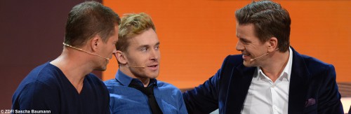 Ein bewegender Moment: Til Schweiger kommt mit Samuel Koch auf die Bühne.