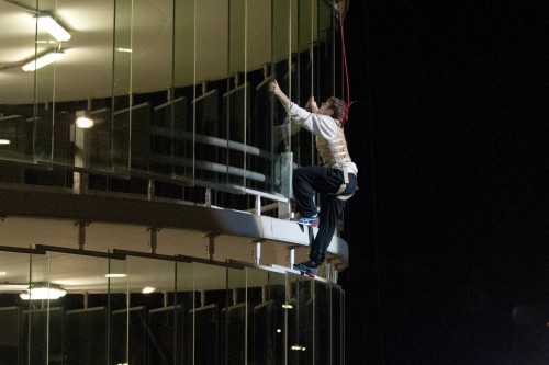 Jakob Vöckler kletterte eine Fassade schneller hoch als Rallye-Weltmeister Sebastian Ogier mit seinem Boliden hoch fuhr.