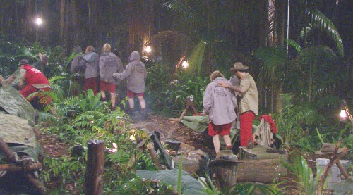 Nach einem sonnigen Tag zieht ein starkes Gewitter mit Sturmböen, Blitz und Donner über dem Dschungelcamp auf. Urplötzlich setzt tropischer Starkregen ein und die Camper fliehen schnell ins Dschungeltelefon.