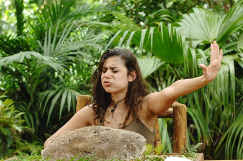 Die Finalistin Tanja Tischewitsch bei ihrer letzten Dschungelprüfung. Sie muss ein fünf Gänge-Menü mit erlesenen Busch-Köstlichkeiten verspeisen. Sie kann aber für eine echte Leckerei entscheiden. Nachdem sie eine Portion Spaghetti mit Tomatensoße abgelehnt hat, macht sie sich an ein Stück Kamel-Höcker, das sie vor Ablauf der Zeit schafft runter zu schlucken.