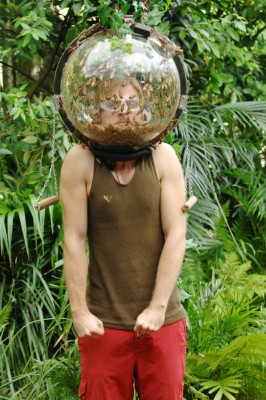 Der Finalist Jörn Schlönvoigt (28) bei seiner letzten Dschungelprüfung. Er muss fünf Minuten mit dem Kopf in einer Glaskugel aushalten in die nach und nach rund 5.000 Kakerlaken, 2.000 Grillen, zehn Riesenkakerlaken, 15 Huntsmen- und Wasserspinnen sowie 200 Soldatenkrabben eingefüllt werden.