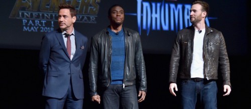 Robert Downey Jr. (l.) und Chris Evans (r. ) begrüßen ihren «Captain America: Civil War»-Co-Star Chadwick Boseman, der in kommenden Marvel-Filmen Black Panther spielen wird, einen jungen König, der zum Schutze seines Volkes eine kämpferische Geheimidentität annimmt.