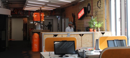 Mitten in den großen Redaktionsraum wurde nämlich ein zum Teil verglastes, kleines News-Studio erbaut, aus dem demnächst ein Moderator die Zuschauer des Senders RTL II begrüßen wird. Frei bewegliche Kameras ermöglichen damit auch den Blick auf die arbeitenden Redakteure. Über HD-fähige Rückprojektoren werden Bilder und Grafiken auf eine Leinwand geworfen, die aktuelle Nachrichten auch im Studio visualisieren können. Zudem sorgen LED-Panels dafür, dass Hashtags zu bestimmten Themen eingeblendet werden und die farbliche Gestaltung der Elemente sich einem bestimmten Ressort anpassen kann. Das passiert etwa an kleinen Säulen, an die sich die Präsentatoren der News künftig lehnen können.