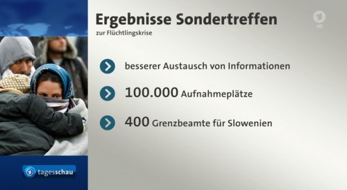 Er war somit einer der ersten deutschen Journalisten, die – während des noch laufenden Gipfels – schon von der später so viel zitierten katastrophalen Stimmung bei den Teilnehmern sprachen und einen „16-Punkte-Plan“ (aus dem letztlich ein „17-Punkte-Plan“ wurde) ins Spiel brachte. Bei solchen Komplexen setzt die «Tagesschau» mittlerweile deutlich mehr auf Grafiken als früher. Auch in diesem Punkt waren die News-Sendungen der Privaten wohl Vorbild. Die wichtigsten Ergebnisse des Sondertreffens der EU präsentierte die Sendung auch noch einmal in Wort und Bild – wohl gemerkt nicht alle 17 Vorhaben, sondern nur die Bedeutendsten.