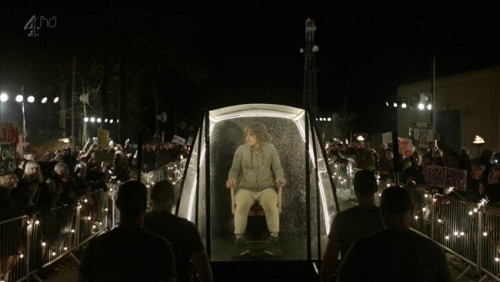 Zur gleichen Zeit läuft auf Betreiben der engsten Vertrauten des Premierministers auch schon ein Notplan an, von dem nicht mal dieser etwas ahnt. Ein Fernsehstudio wird vorbereitet, ein Pornodarsteller engagiert und ein Special-Effects-Team damit beauftragt, im Fall der Fälle eine Möglichkeit zu finden, Callows Abbild live auf den Körper des Darstellers zu legen – während dieser… na Sie wissen schon. Die öffentliche Demütigung würde Callow diese Farce sicher nicht ersparen, doch zumindest die körperliche.