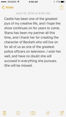 «Castle». Hauptdarstellerin Stana Katic kündigte an, die Serie nach der achten Staffel zu verlassen. Unmittelbar nach ihrer Ankündigung kamen Gerüchte auf, dass sie die Serie aufgrund eines Streits mit Nathan Fillion verlassen würde. Offiziell wurde diese Meldung jedoch nicht bestätigt, denn im Raum stehen auch Spekulationen um zu hohe Gehaltsforderungen der weiblichen Hauptdarstellerin. Fakt ist aber, dass der Ausstieg einer der beiden wichtigsten Figuren nicht als positiver Indikator für eine potenzielle neunte Staffel, die noch immer nicht bestellt ist, gilt. Nachdem die erste Welle der Empörung und Trauer der Fans abklang, äußerte sich Hauptdarsteller Nathan Fillion zum Ausstieg seiner Serienpartnerin und hatte dabei lediglich positive Worte für sie übrig.