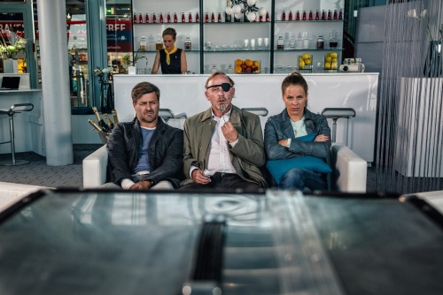 "München Mord – Kein Mensch, kein Problem“: Die Kommissare Ludwig Schaller (Alexander Held), Harald Neuhauser (Marcus Mittermeier) und Angelika Flierl (Bernadette Heerwagen) sitzen in der Flughafen-Lounge.