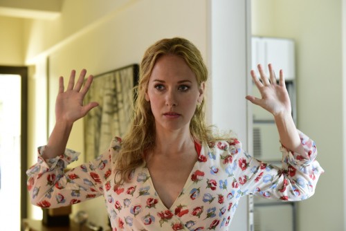 "München Mord - Einer der's geschafft hat": Sekretärin Marlene Sartorius (Mette Lysdahl) steht mit erhobenen Händen in der Villa Horvath.