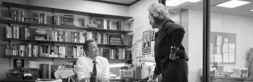 Der Grund, weshalb wir bislang nicht näher auf die Qualität des Films als solchen eingegangen sind, ist, dass der Film an sich gar nicht so viel hergibt, um sich ausgiebig damit auseinander zu setzen, ob er nun gut, oder eher weniger gut ist. Das ist eindeutig ein Indiz für Letzteres, denn «Die Verlegerin» mag ein überdeutliches Projekt seiner Zeit sein, das ein Thema anspricht, das in keinem Jahr besser zur Geltung käme; schließlich wird nicht bloß in den USA plötzlich das Recht auf freie Meinungsäußerung, insbesondere aber die Pressefreiheit durch Fake-News-Diskussionen und Co. in Frage gestellt, sondern rund um den Globus. Gleichzeitig lässt sich das Kalkül hinter dem Film so aber ebenso wenig leugnen. Penibel hangelt sich das Skript von Liz Hannah («Guidance») und Josh Singer («Spotlight») von einem wichtigen Handlungsschauplatz zum nächsten, rekapituliert die vielen, vielen Dialoge in den Redaktionsräumen der Washington Post und setzt sie in Kontrast zu den sich parallel dazu abspielenden Geschehnissen im Weißen Haus.