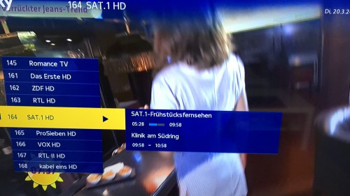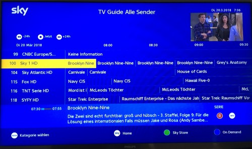 Der weiße Startbildschirm etwa ist dem neuen hellblau von Sky gewichen, das künftig auch bei Sky Home, Sky On Demand und im eigenen Aufnahmen-Archiv das zuvor dunklere blau ersetzt. Neu ist die Farbe Gelb für markierte Inhalte. Stärker präsent als bis dato sind Programm-Empfehlungen von Sky. Zudem läuft auf der Sky-Home-Seite am oberen Bildschirmrand nun immer das Live-Programm.